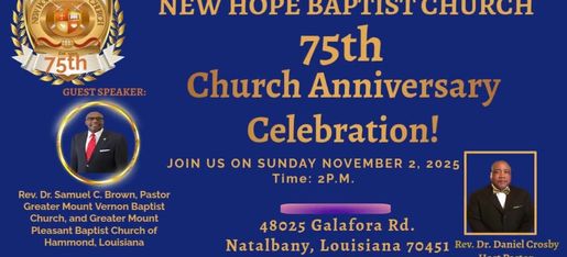 Here at New Hope Baptist Church, We believe that Jesus Christ is the Son of God and that through Him, we can receive salvation. Our mission is to share the Gospel and Minister to the spiritual needs of our community in Natalbany, LA. Join us for Worship, Bible Study, and Fellowship as we grow in our Faith Together.